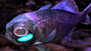 ヒカリキンメダイは目の下に発光バクテリアを住まわせており、それを表に出したり裏に引っ込めたりすることで発光させています。
