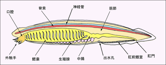 腹部には楕円形の生殖腺が30個以上ならび、尾の部分は皮膚と脊索が伸びて糸状になっています。