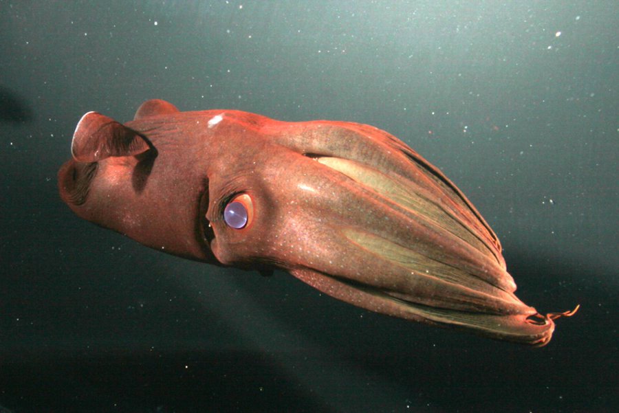 コウモリダコの大きな眼は非常に複雑なつくりになっており、真っ暗な深海の中で小さな発光も見逃しません。
